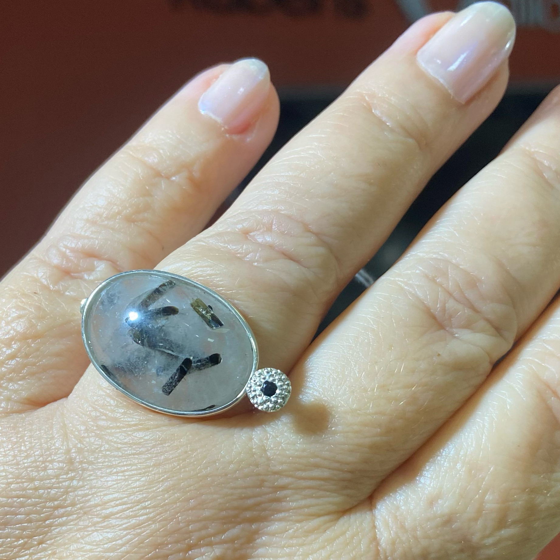 Anel em prata 950, quartzo turmalinado e onix, produzido artesanalmente